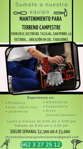 PERSONA PARA MANTENIMIENTO EN TERRENO CAMPESTRE, VIVIR EN SECTOR EL TAZAJAL, SAN PEDRO, LA VICTORIA, EL CAMPESTRE SE UBICA EN LA COLONIA TABACHINES, SABER PLOMERIA, INSTALACIONES ELECTRICAS, JARDINERIA, ALBAÑILERIA, CARPINTERIA, AIRES ACONDICIONADOS, TRABAJO DE LUNES A VIERNES DE 8 AM A 4 PM Y SABADOS DE 8 AM A 2 PM, PAGO SEMANAL DE $2,500 A $3,000 SEGUN EXPERIENCIA