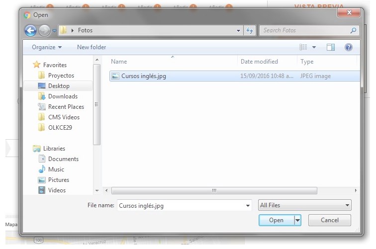 Si desea agregar fotografías o imágenes a su anuncio primero hay que localizar el archivo de la imagen. Para eso haga clic en el botón "Añadir" y enseguida se abrirá una ventana para localizar el archivo.