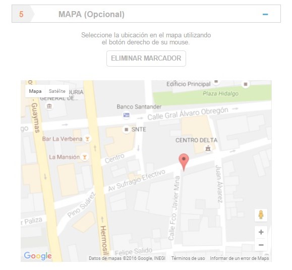 Localice en el mapa la ubicación requerida y selecciónela dando clic con el botón derecho de su mouse. Si desea removerla o la agregó por error, dé clic en el botón "Eliminar marcador".