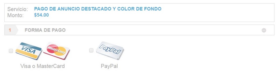 Seleccione la opción mediante la que realizará el pago de su anuncio, en caso de haber solicitado atributos adicionales. El pago puede realizarse mediante tarjeta de crédito VISA o MASTERCARD, o bien con su cuenta de PayPal.