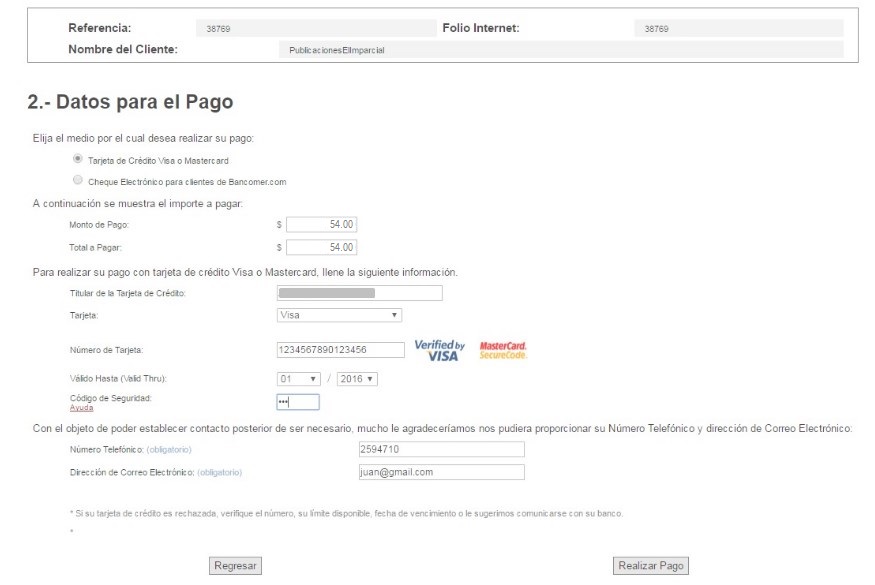 Deberá ingresar sus datos de contacto y de su tarjeta de crédito. Una vez hecho, dé clic en el botón "Realizar pago."