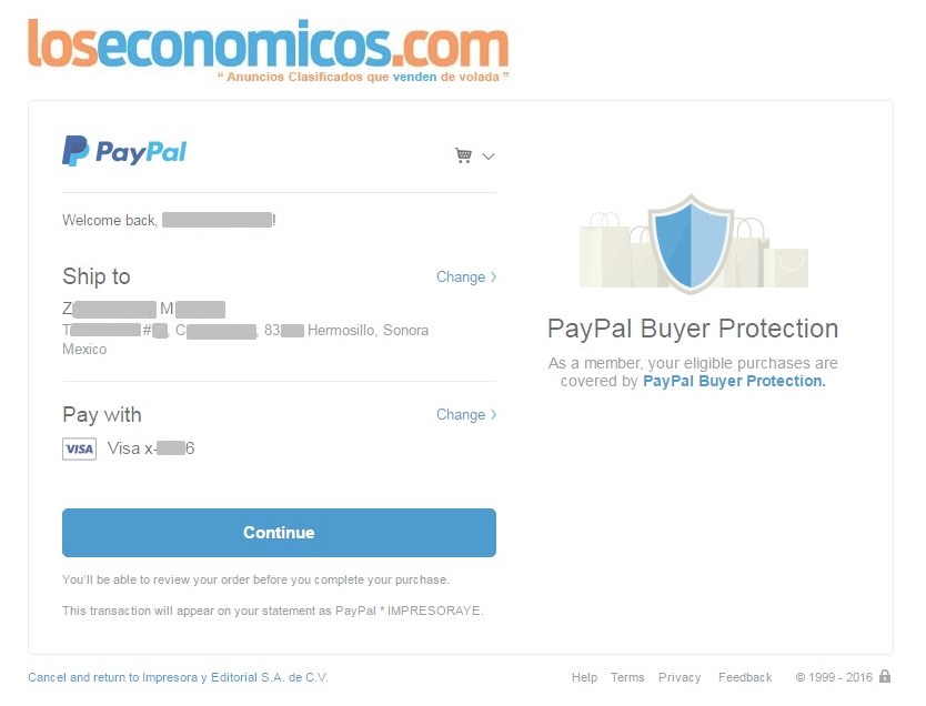 Una vez que haya ingresado a su cuenta de PayPal, se le mostrarán sus datos, que pueden ser editados. Habiendo verificado que todo sea correcto, dé clic en "Continuar".