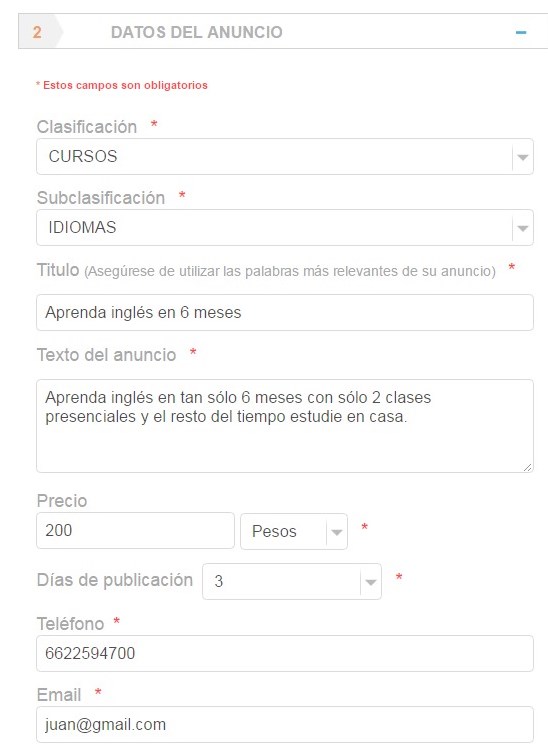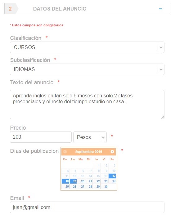 Proceda a llenar los datos del anuncio seleccionando la clasificación correspondiente y de igual forma indique el número de días que desea publicar su anuncio.