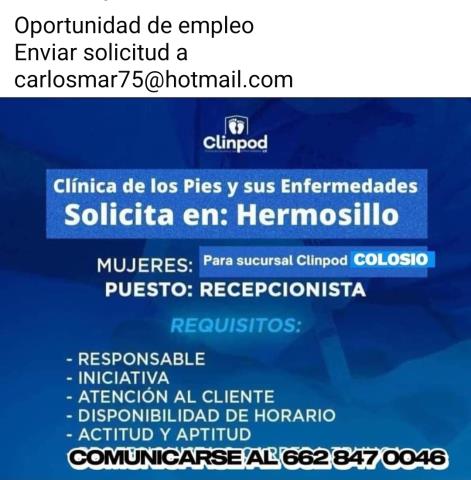 Clinpod sucursal Colosio solicita recepcionista. Interesados enviar solicitud al correo carlosmar75@hotmail.com o llamar al 6628470046