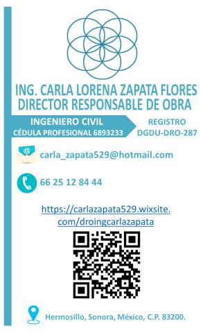 Servicios profesionales de Director Responsable de Obra (D.R.O.) del H. Ayuntamiento de Hermosillo, Sonora, México. Página web: https://carlazapata529.wixsite.com/droingcarlazapata