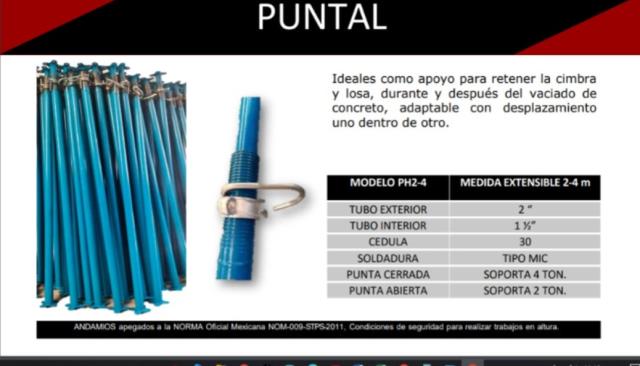 Los puntales metálicos o pies derechos, se utilizan principalmente como apoyo para retener las cimbras y losas antes, durante y después del vaciado del concreto, es adaptable y fabricado en acero
