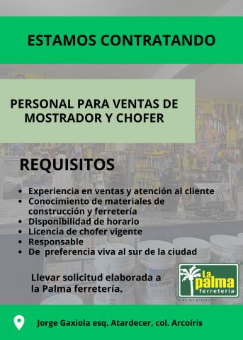 Se solicita empleado para ferretería, llevar solicitud elaborada a la palma ferretería (Jorge Gaxiola esquina atardecer, col. arcoíris)