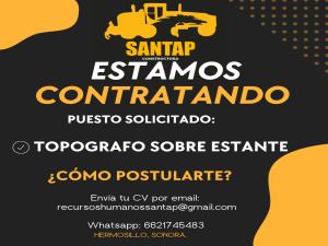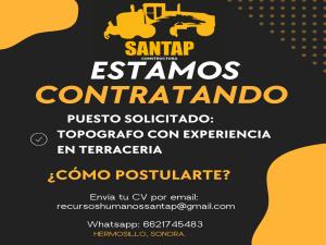 Estamos buscando topógrafo con experiencia en terracerías y topógrafo sobrestante. Contáctanos en nuestro WhatsApp 6621745483 o mándanos tu cv a nuestro correo: Recursoshumanossantap@gmail.com