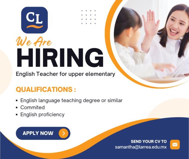 Enviar CV con fotografía a recursoshumanos@larrea.edu.mx o acudir directamente aJuan García Cabral #50 esq. Justo Sierra Col. Periodista, de 7:00 a 14:00 hrs.