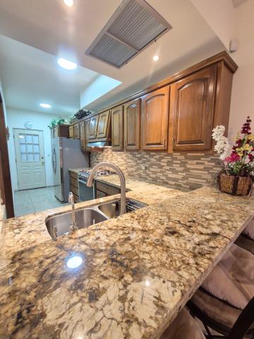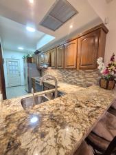 Cocina con granito, estufa, refrigerador y filtro se osmosis inversa.