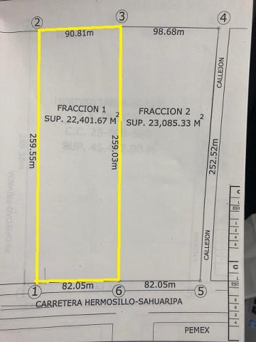 TERRENO EN VENTA EN HERMOSILLO DE 22,401.67 M2 EN EL PARQUE INDUSTRIAL POR LA CARRETERA HERMOSILLO - SAHUARIPA FRENTE A LA BIMBO.- FRACCIÓN I.-