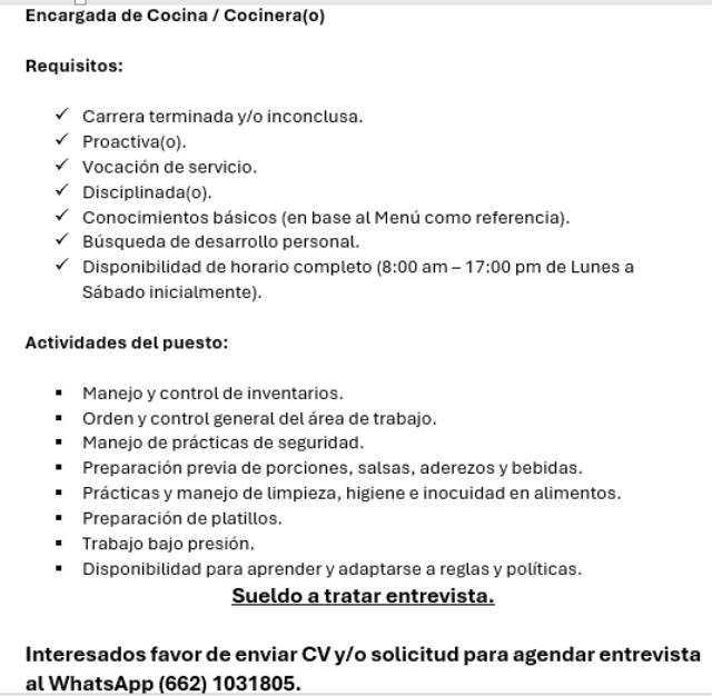 Interesados favor de enviar CV y/o solicitud para agendar entrevista al WhatsApp (662) 1031805.