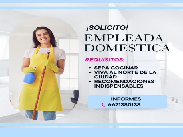 Solicito empleada domestica Requisitos: sepa cocinar, viva al norte de la ciudad, recomendaciones indispensables Informes: al 6621380138