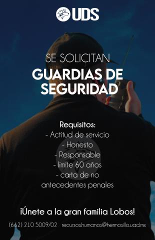 Universidad Durango Santander solicita guardias de seguridad, si te interesa formar parte de la gran Familia Lobos favor de enviar su solicitud al correo recursos.humanos@hermosillo.uad.mx